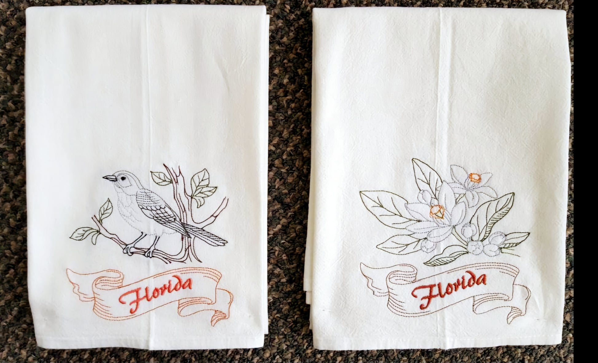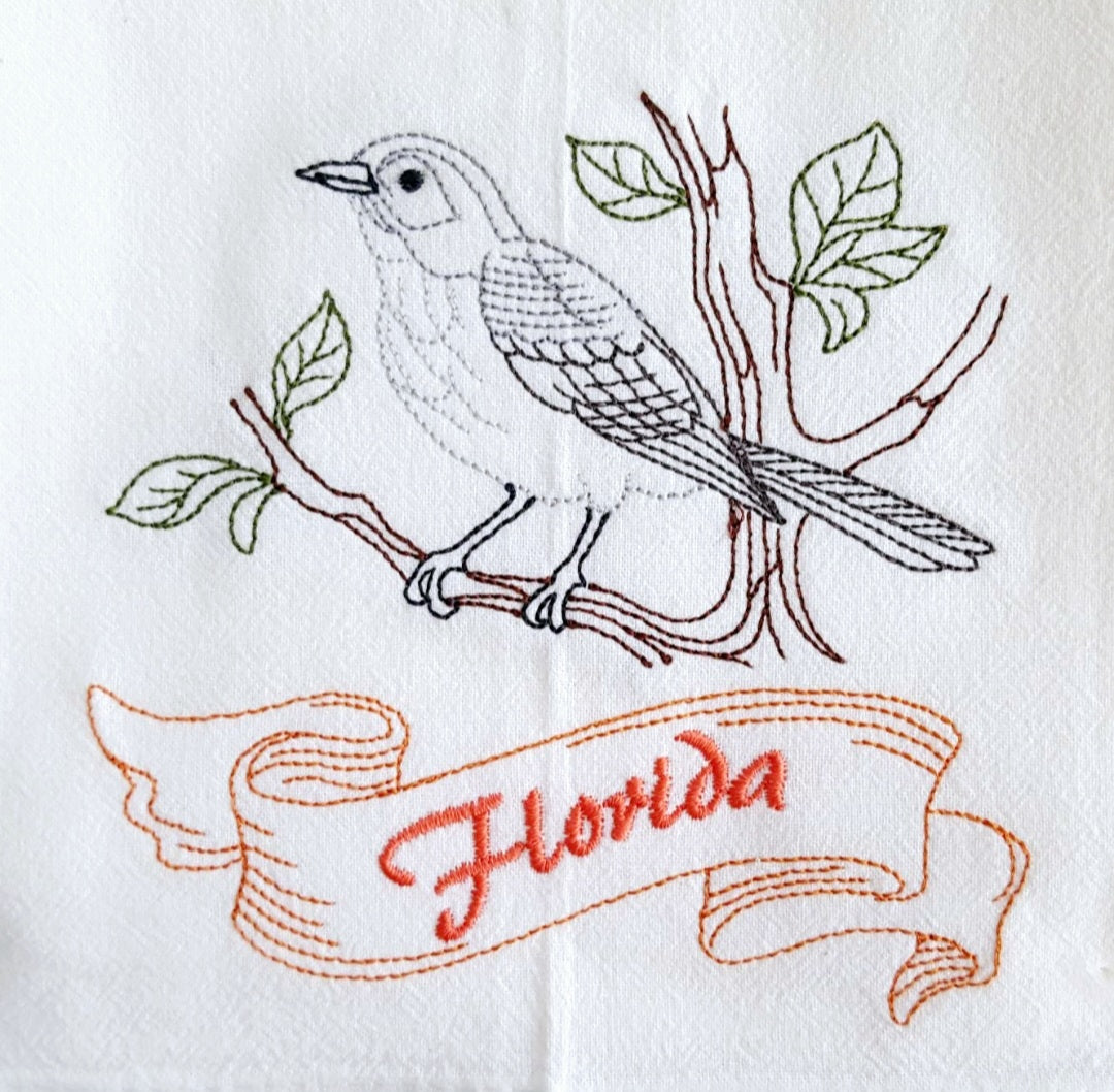 Florida State Bird Mockingbird OR State Flower Orange Blossom Machine Embroidered Flour Sack Dish Towel