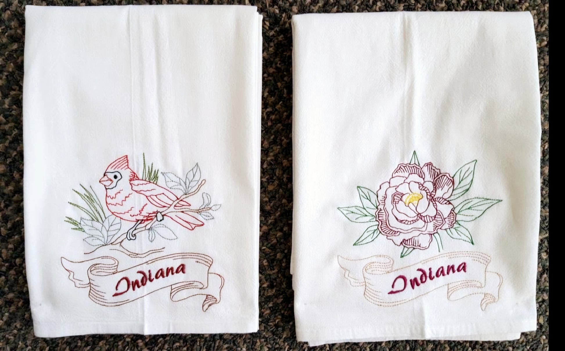 Indiana State Bird Cardinal OR State Flower Peony Machine Embroidered Flour Sack Dish Towel