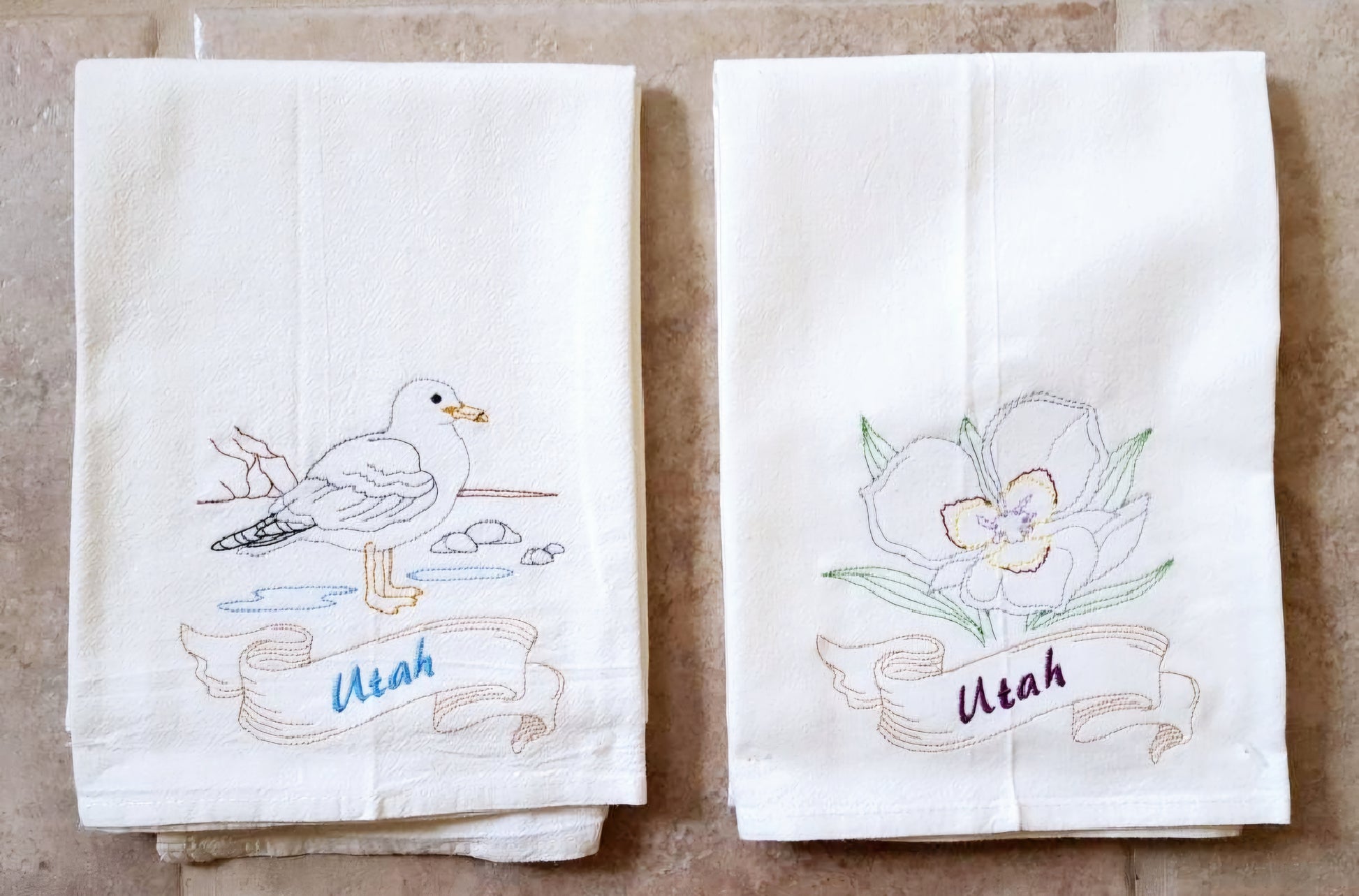 Utah State Bird California Gull OR State Flower Sego Lily Machine Embroidered Flour Sack Dish Towels