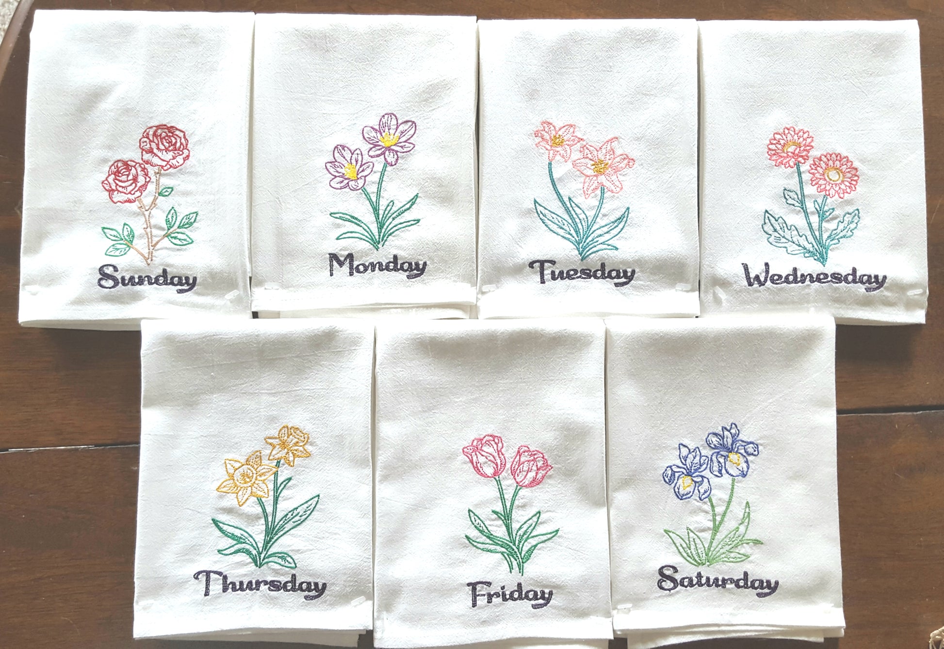 Vintage Flowers Days of the Week Machine Embroidered Flour Sack Dish Towels