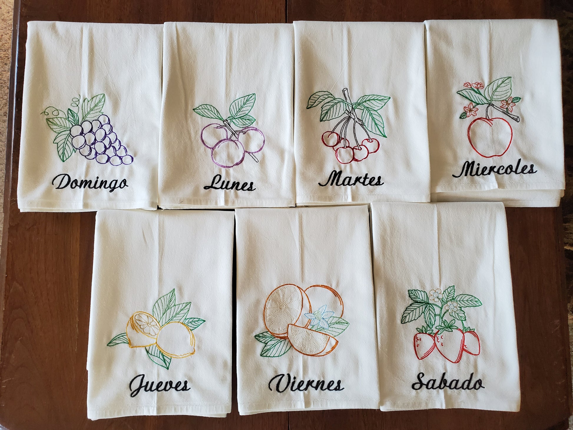 Vintage Fruit Days of the Week SPANISH Machine Embroidered Flour Sack Dish Towels